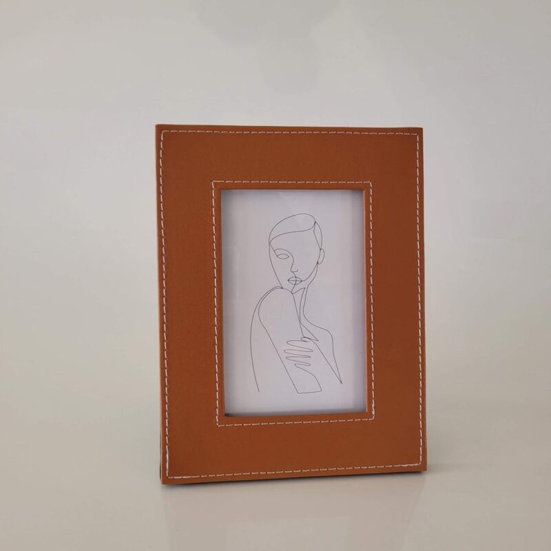 Porta retrato em MDF preto, com detalhe frontal em corino marrom. Para fotografia 10 x 15cm.