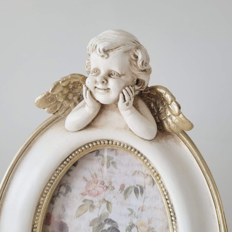 Porta retrato Anjo, com formato oval e cor dourado e branco. Para fotografia 10 x 15.