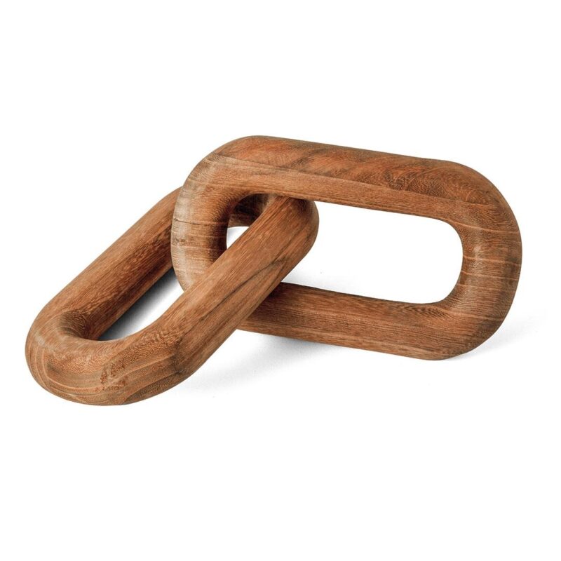 Escultura decorativa de madeira, elos em corrente, na cor marrom.