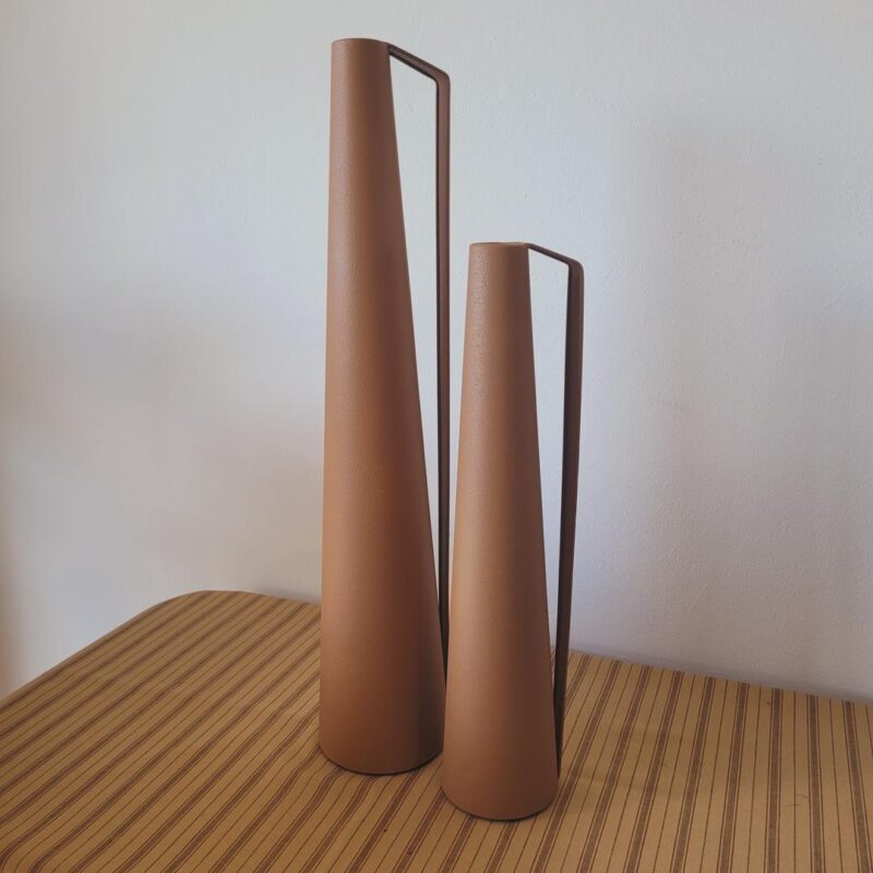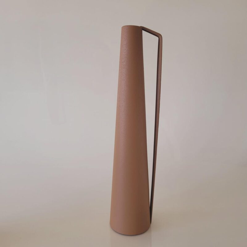 Vaso de metal com formato cônico, com alça, na cor marrom.