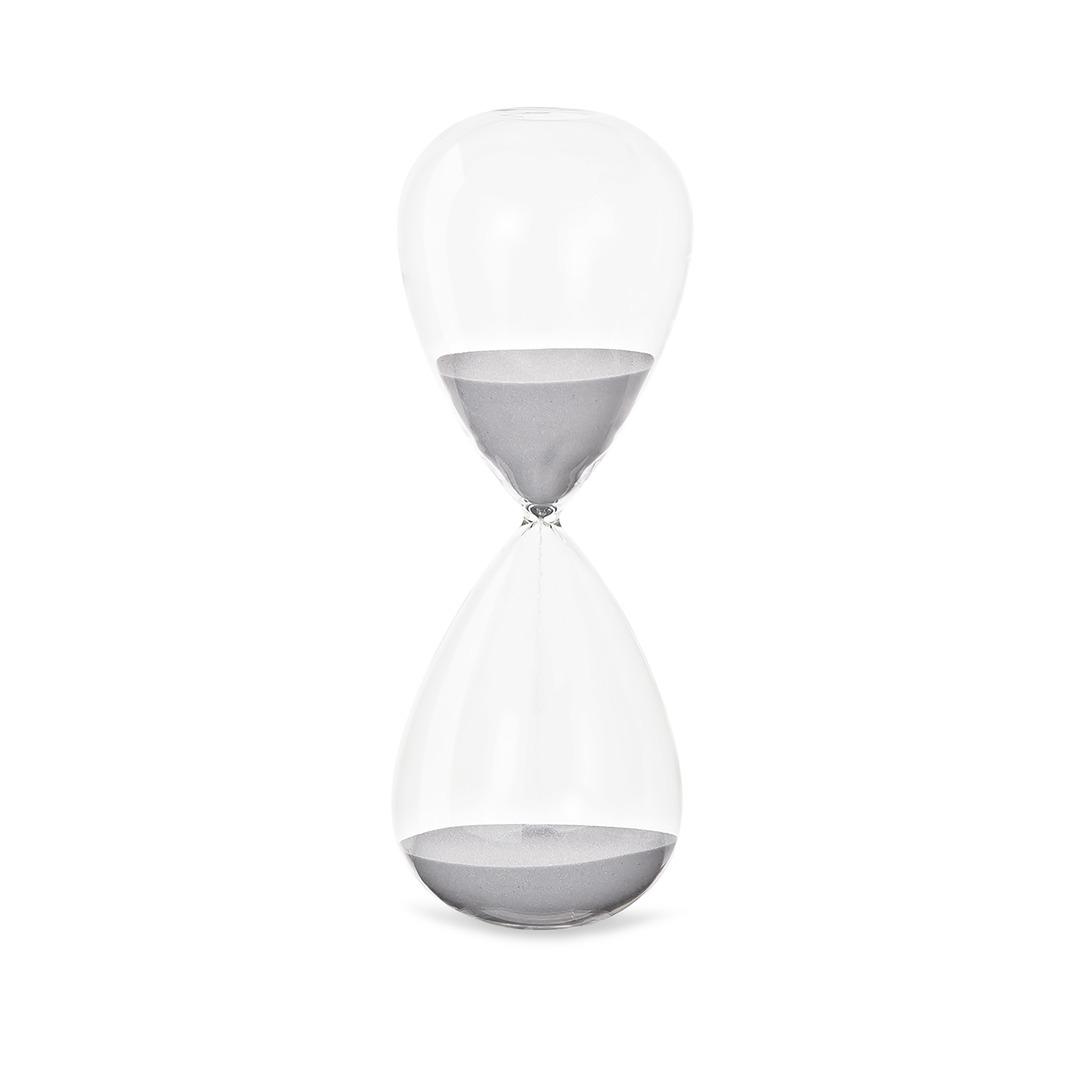 Ampulheta decorativa de vidro incolor liso com areia na cor cinza.