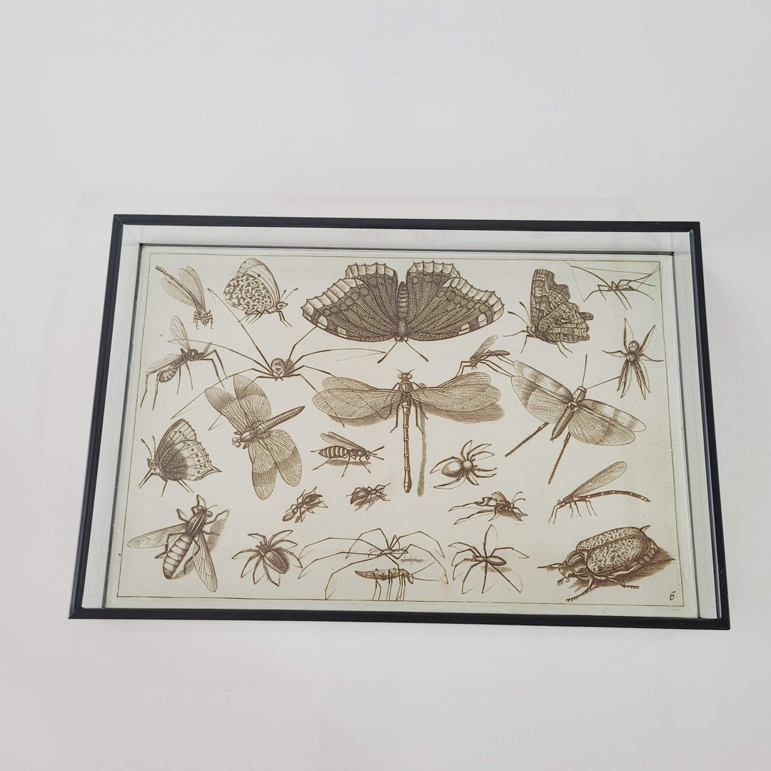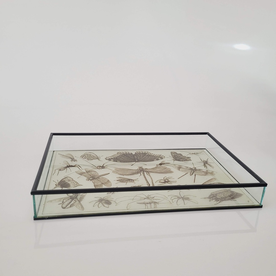 Bandeja decorativa em vidro incolor e metal preto, com imagens na base