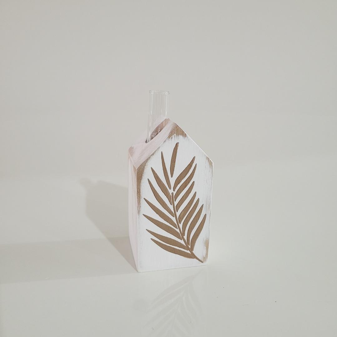 Enfeite decorativo casinha vaso de madeira e vidro, no estilo Farm House com pintura provençal branco.