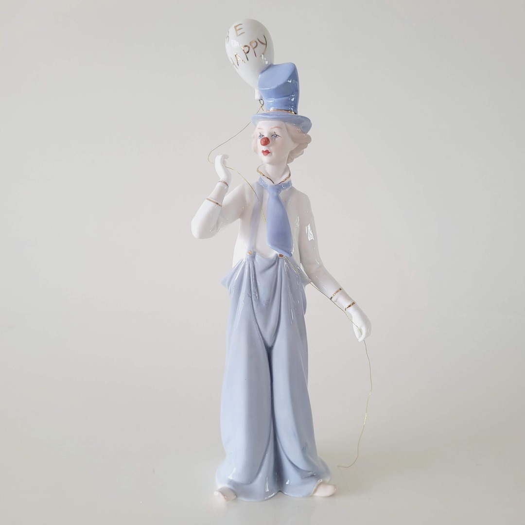 Figura decorativa, escultura de porcelana palhaço com cartola e balão.
