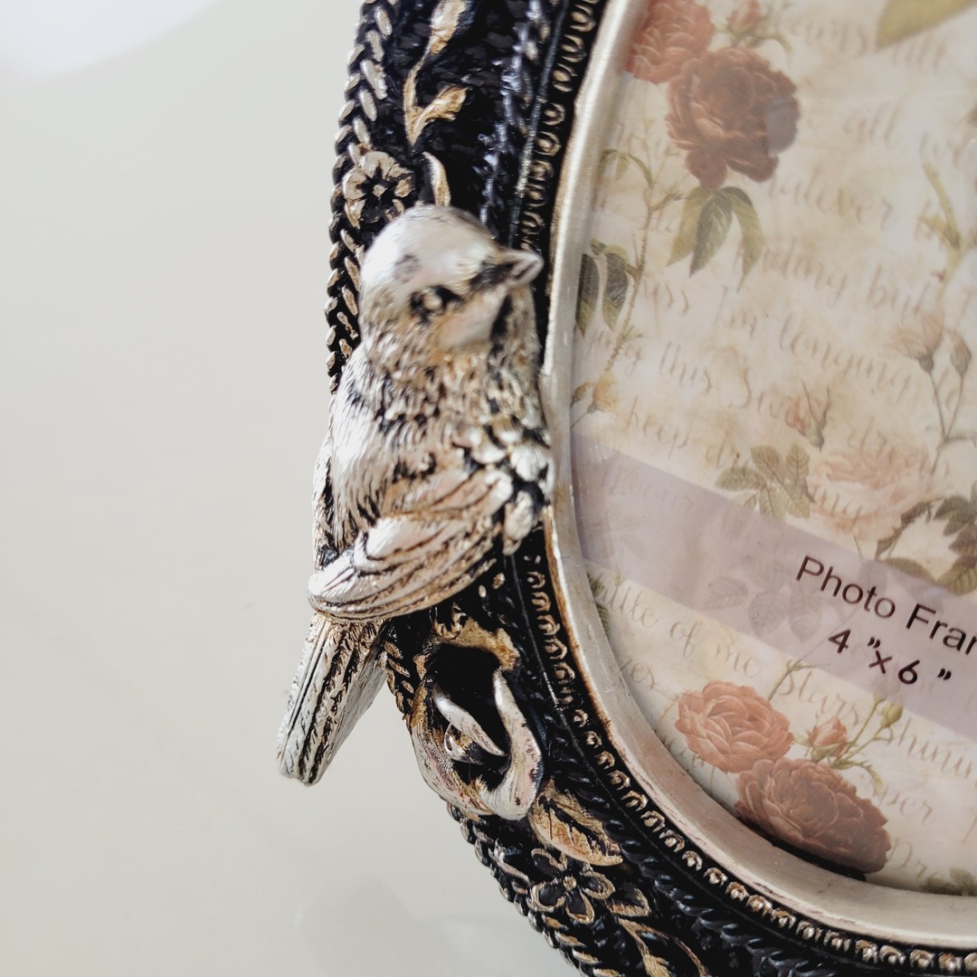 Porta retrato de resina oval com Flores e Pássaros preto com prata (10×15)
