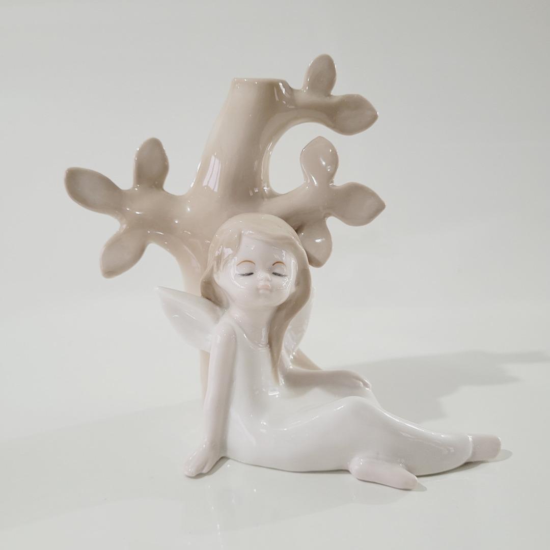 Vaso de porcelana com figura de fada, nas cores branco e bege.